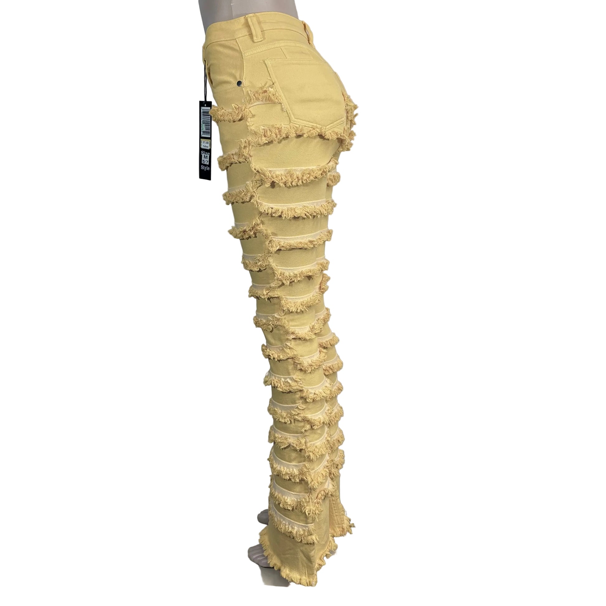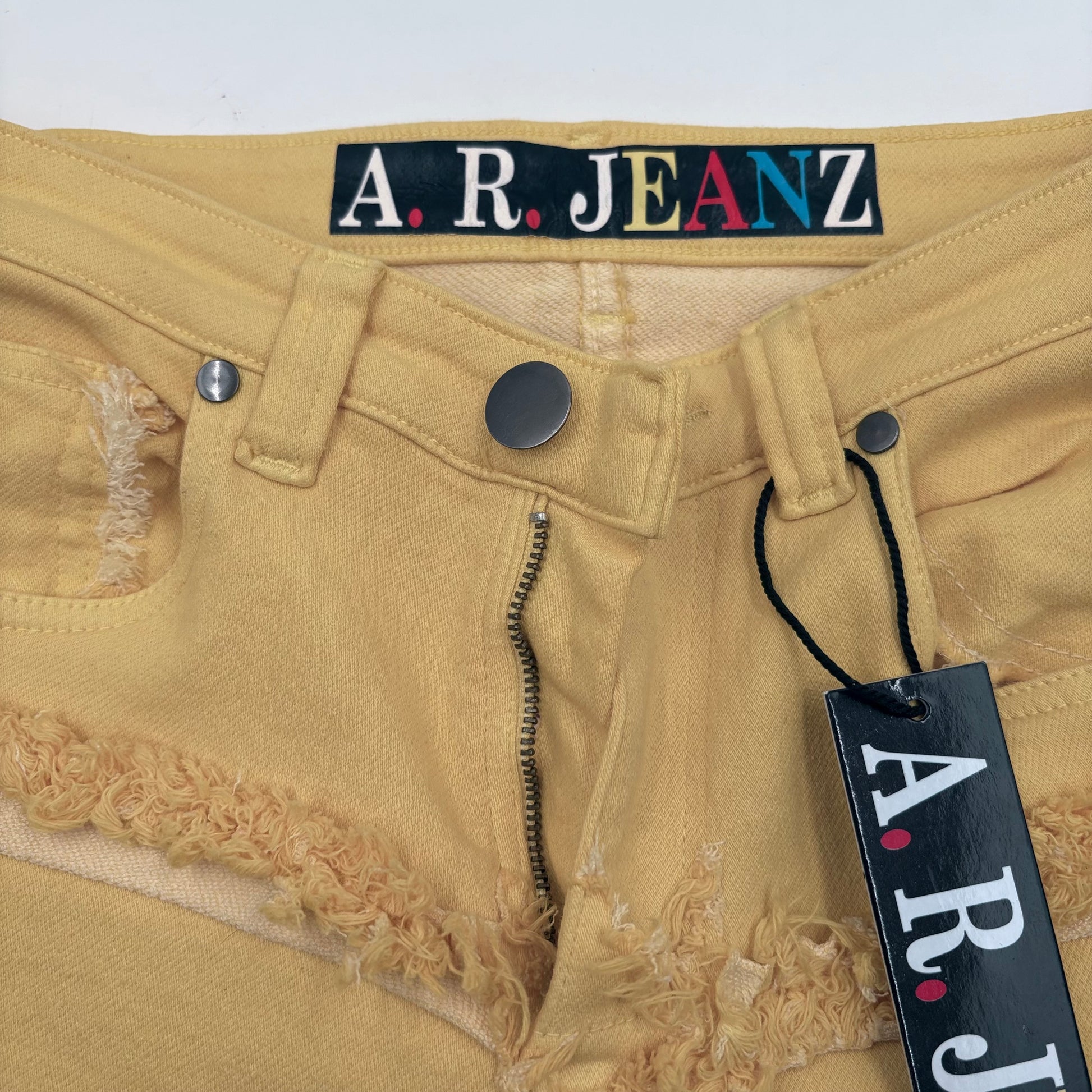 A.R. Jeanz stacked jeans in size 5-7, featuring the brand's signature silhouette with a contemporary stacked leg design. This preowned pair arrives with original tags intact, offering an authentic piece at a fraction of retail. Perfect for collectors or those seeking vintage-inspired denim with minimal wear. The structured fit and quality construction make these a versatile addition to any wardrobe.