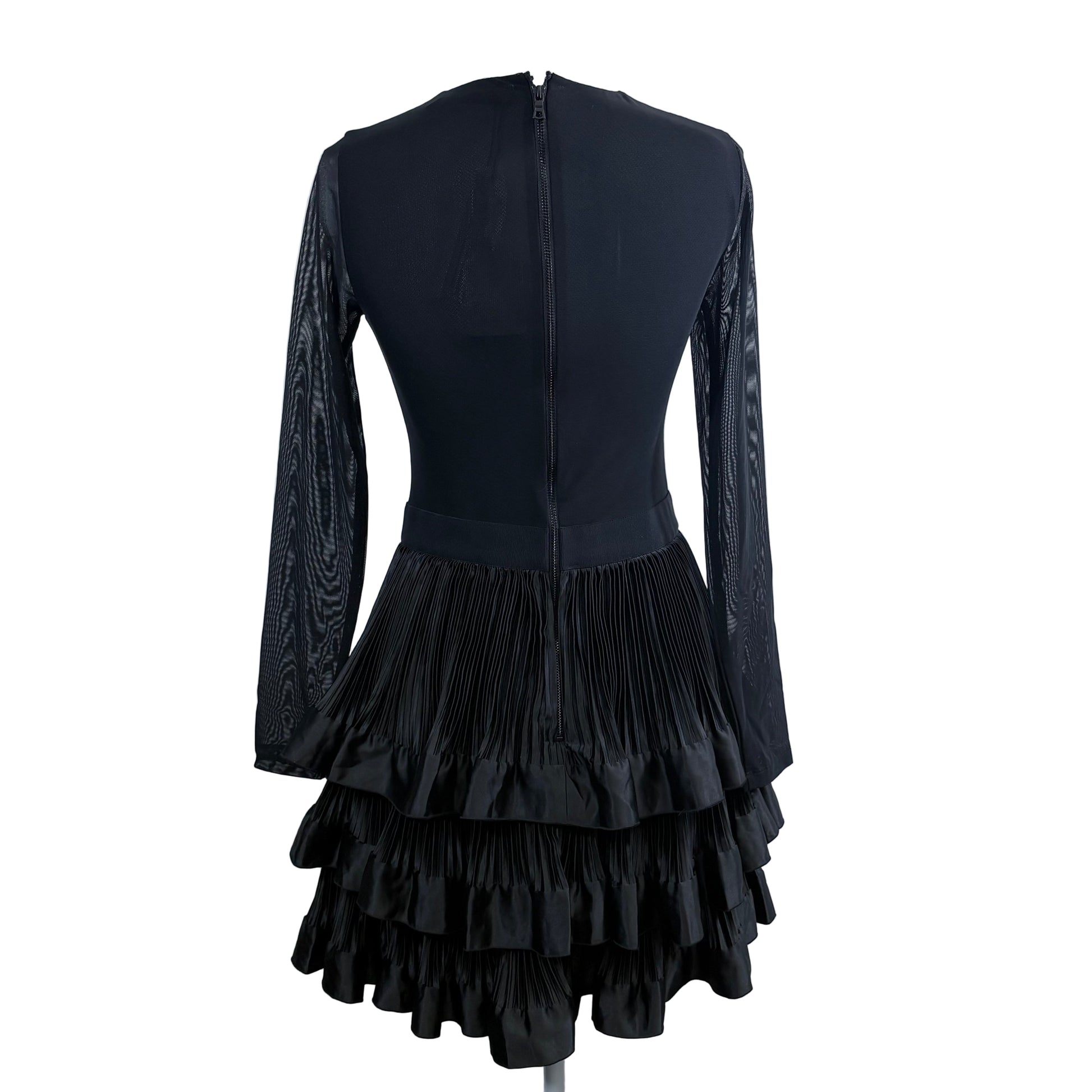 Alice + Olivia sheer mid length pleated ruffle dress with long sleeves, size 4