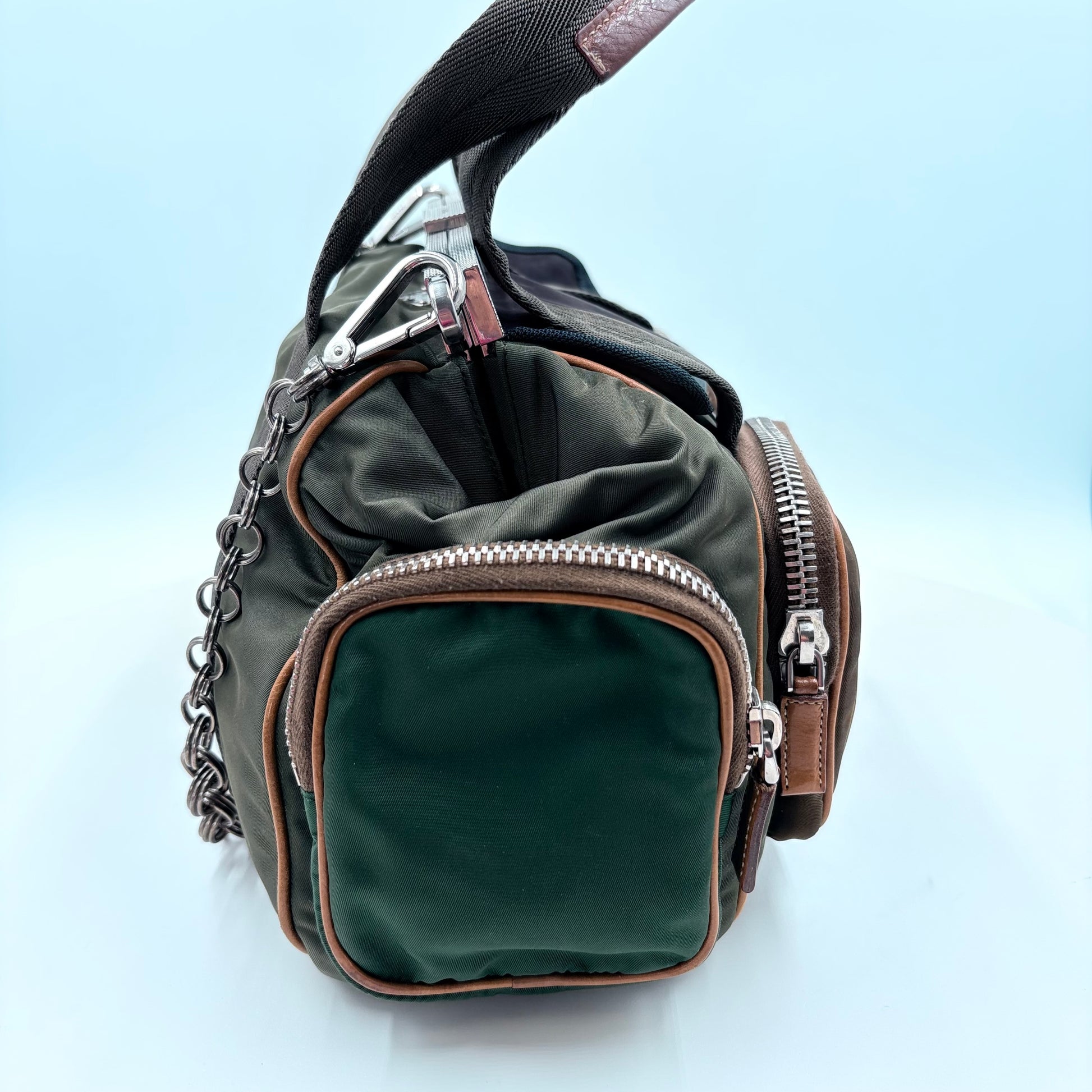 This authenticated Prada nylon multi-pocket shoulder bag is the definition of functional luxury: olive nylon body, rich leather trim, chunky zippers, chain detail, and a wide, comfortable strap that means business. It’s equal parts street, travel, and “I secretly run things” energy.