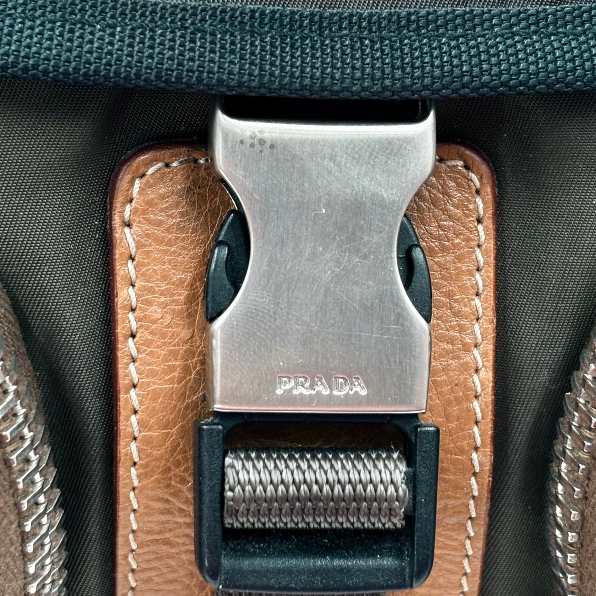 Multiple front and side zip pockets keep everything in its place—phones, keys, cards, chargers—while the main compartment gives you room for your daily essentials. The mix of fabric, leather, and hardware gives it that signature Prada edge: urban, sharp, and never boring.