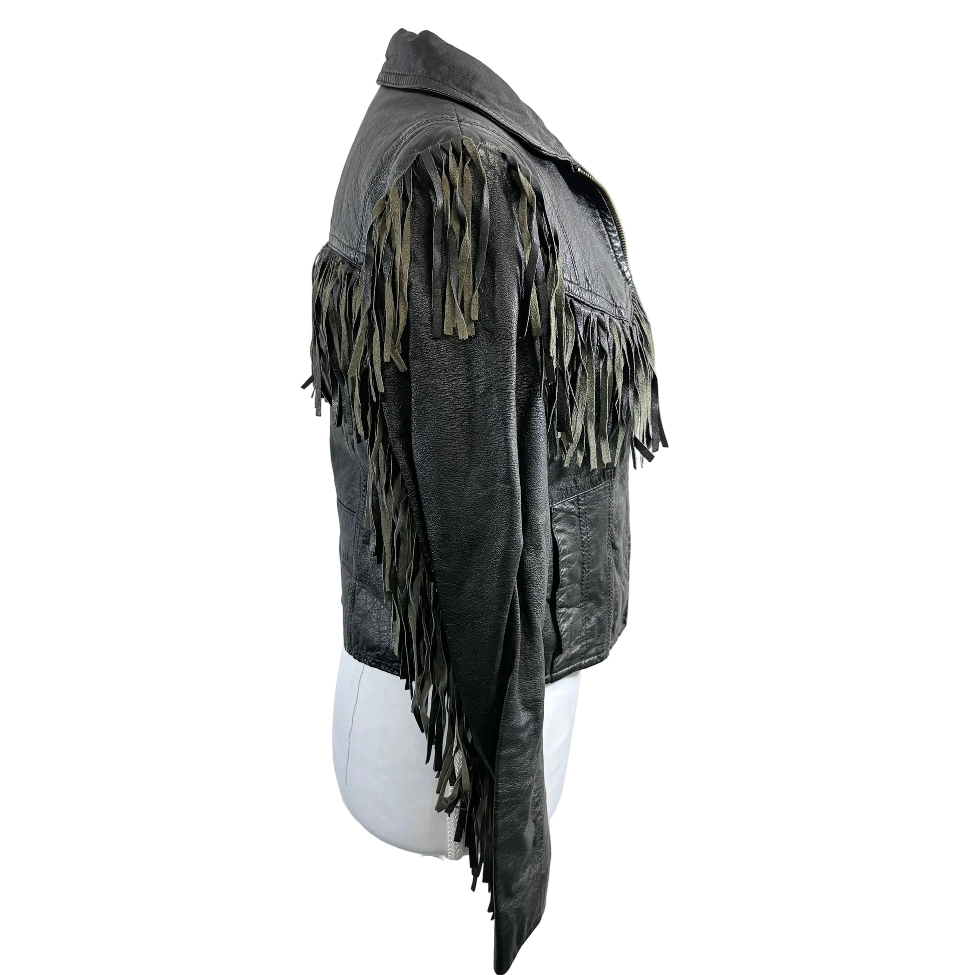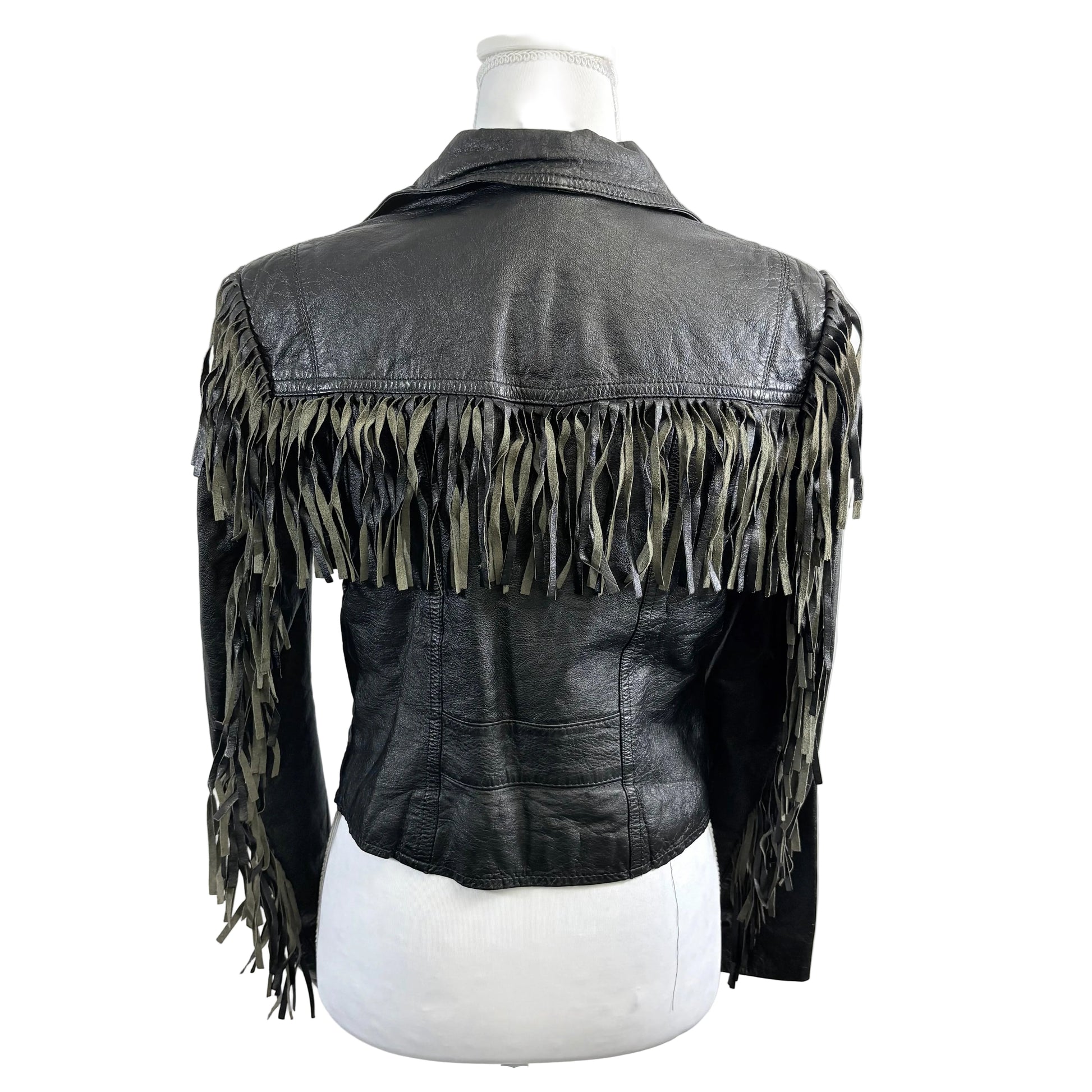 Crafted by Berman's, this fringe leather jacket in size 8 combines vintage appeal with timeless style. The supple leather construction and signature fringe detailing create movement and texture, making it a standout piece for layering or standalone wear. Gently used and well-maintained, this jacket shows minimal wear while retaining its quality and character. Perfect for those seeking authentic vintage fashion with enduring craftsmanship.