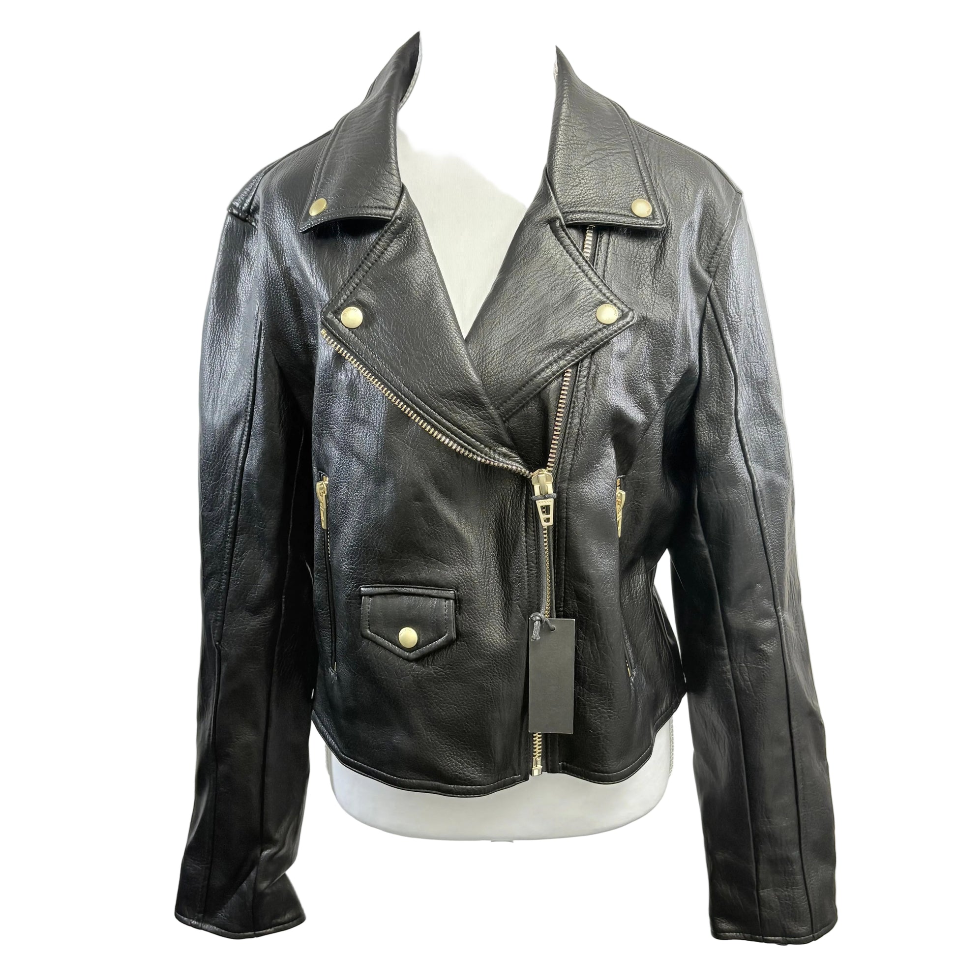 This Blank NYC crop biker jacket combines edgy moto aesthetics with a contemporary cropped silhouette. Crafted in faux leather, the size large features signature hardware, zippered details, and a fitted waistline that works beautifully with high-rise bottoms or layered styling. Still bearing original tags, this pre-owned piece captures the brand's rebellious spirit while offering modern proportions. An investment-worthy staple for building bold, versatile outfits.