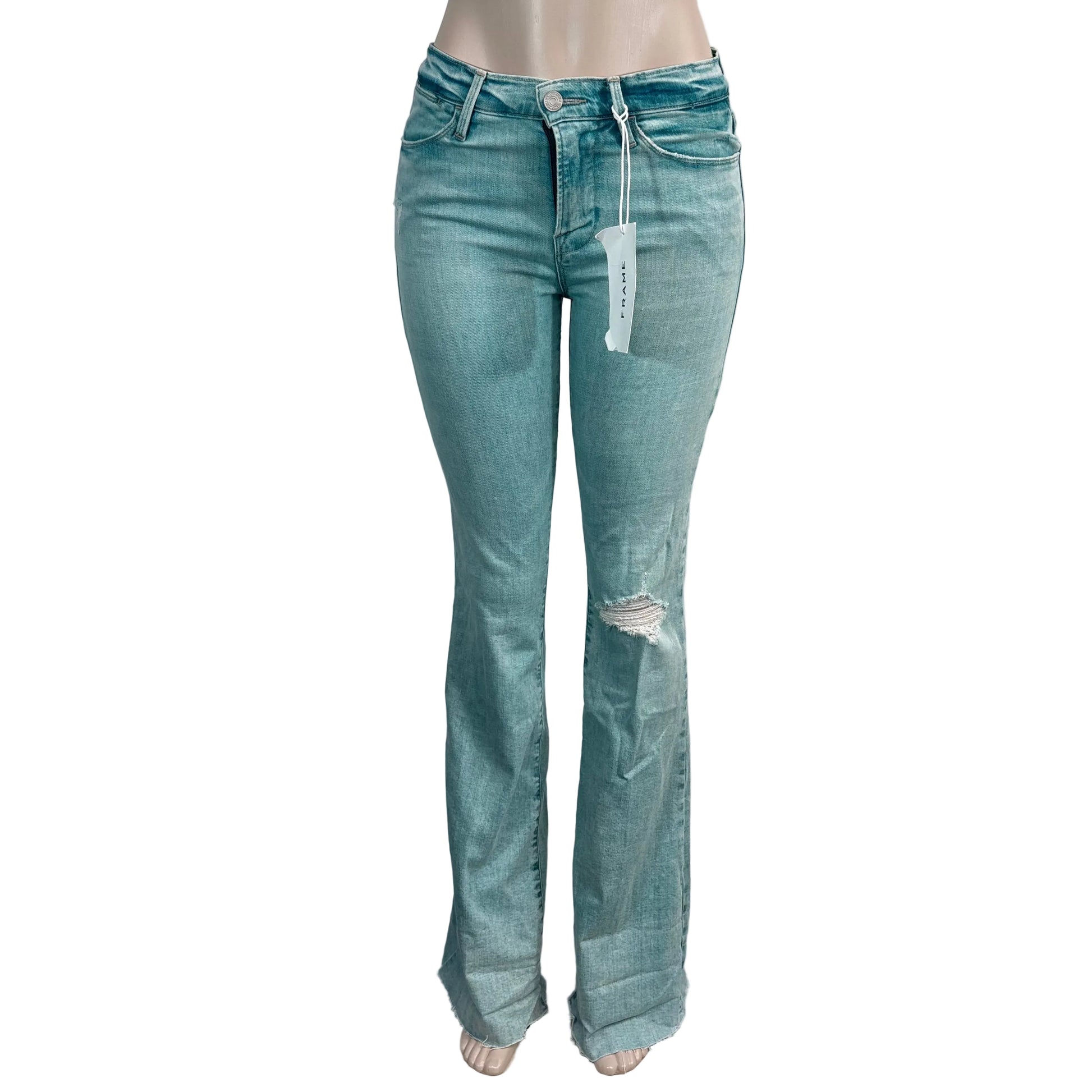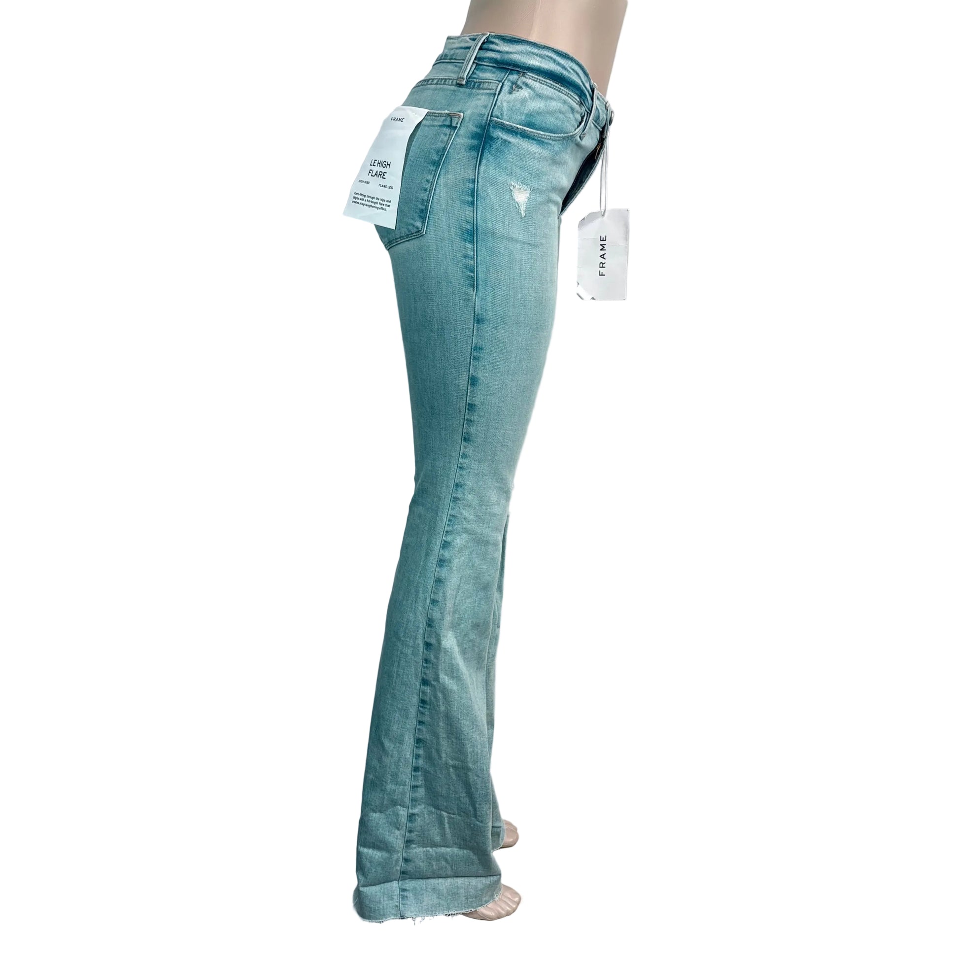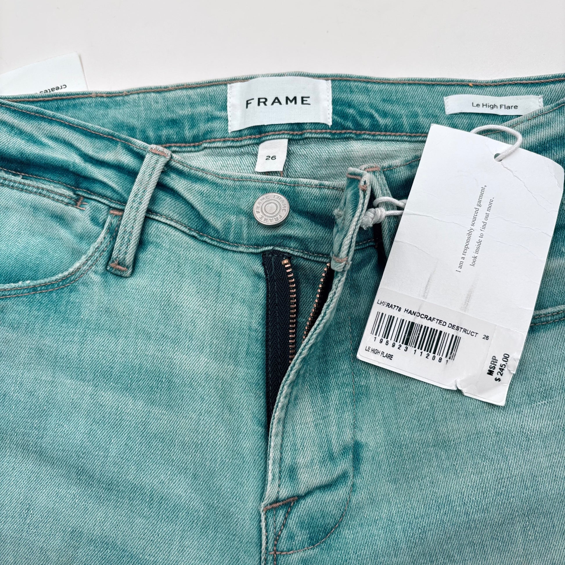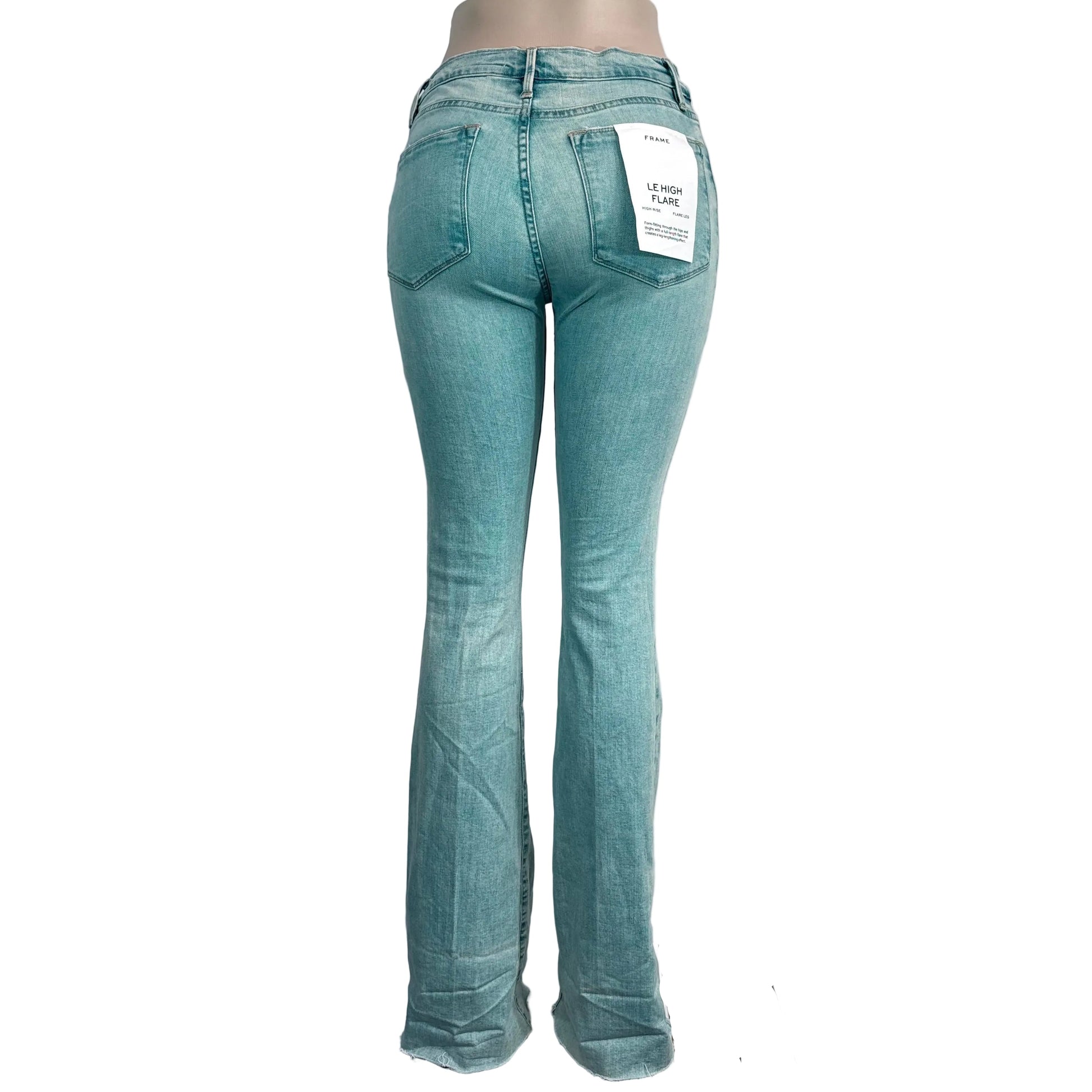 Frame High Flare Jeans – Size 26, New with Tags Elevate your denim collection with these Frame high flare jeans in size 26. Cut from premium denim, these jeans feature a flattering high-rise waist and flowing flare silhouette that balances contemporary style with timeless appeal. The original tags remain attached, confirming their unworn condition and authenticity. Perfect for creating effortless, polished looks that transition seamlessly from casual to elevated occasions. A versatile wardrobe essential for those who appreciate quality construction and refined proportions.