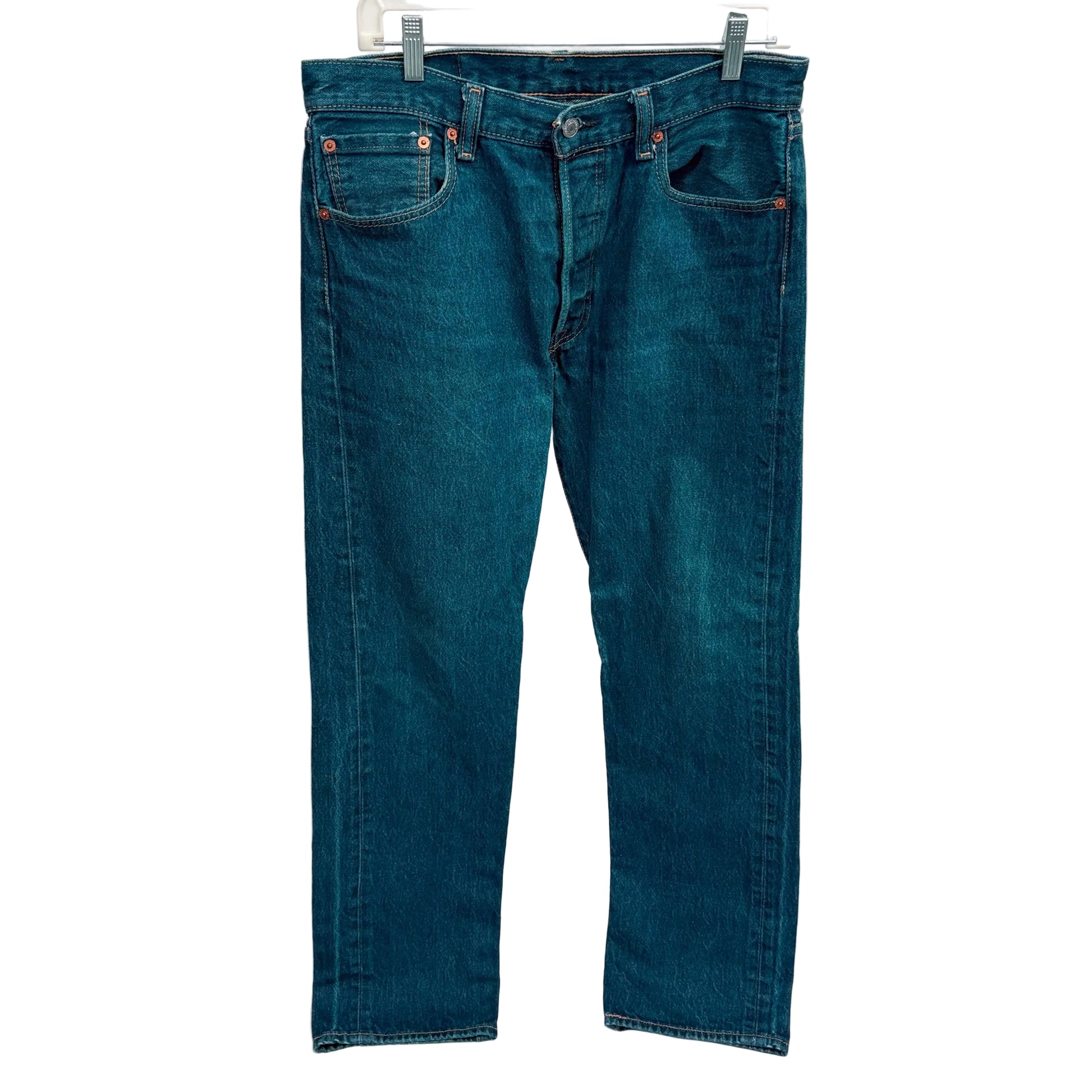 Iconic Levi 501 button fly jeans in a 34" waist, presenting a gently used pair with authentic vintage character. These timeless denim staples feature the signature button fly closure and classic five-pocket construction that defined generations of style. The 501 cut delivers a straight-leg silhouette with a comfortable mid-rise fit, ideal for versatile everyday wear or curated vintage collections. Minimal wear preserves the integrity of the fabric while adding genuine patina. A wardrobe essential that transcends trends, these jeans pair effortlessly with everything from casual tees to tailored shirts.
