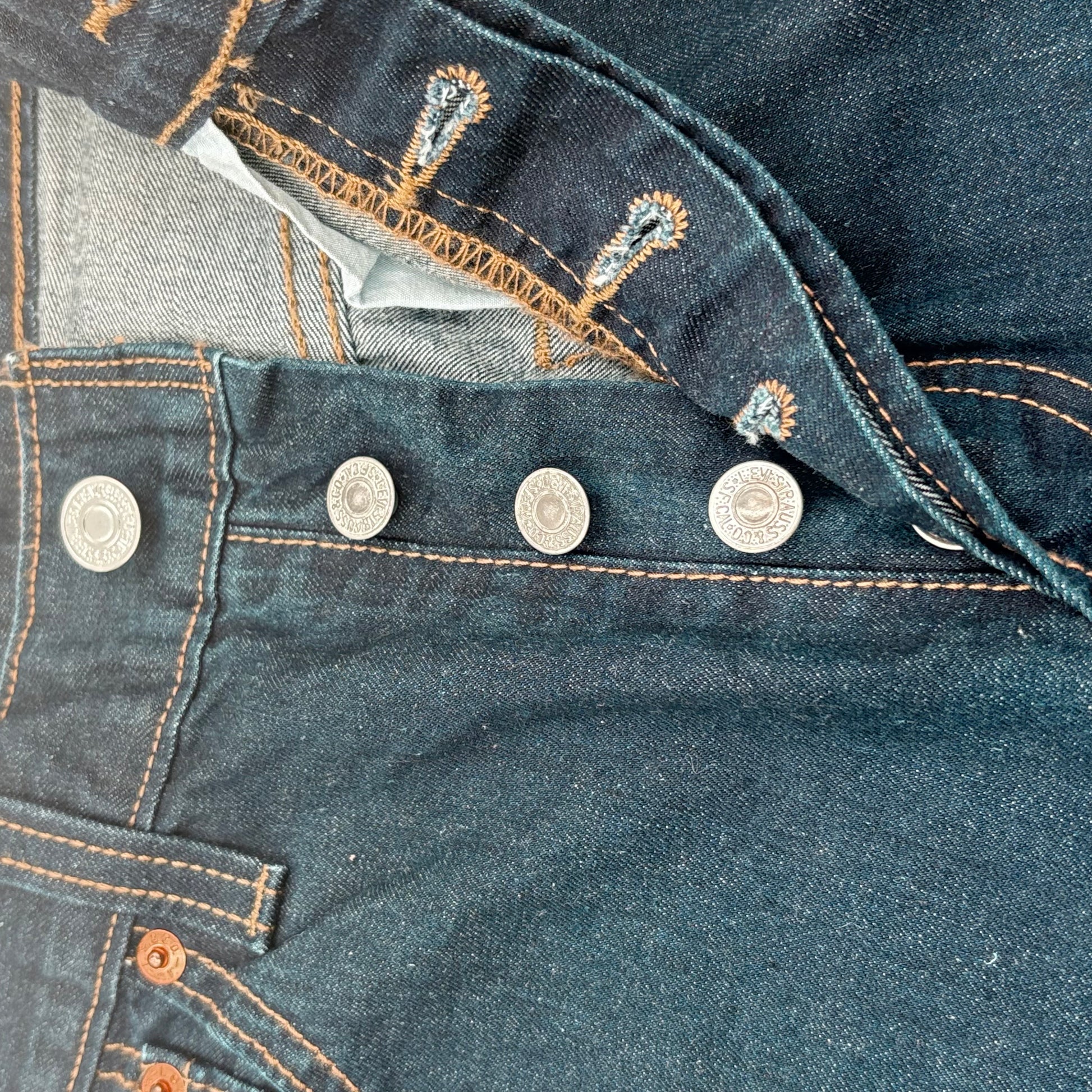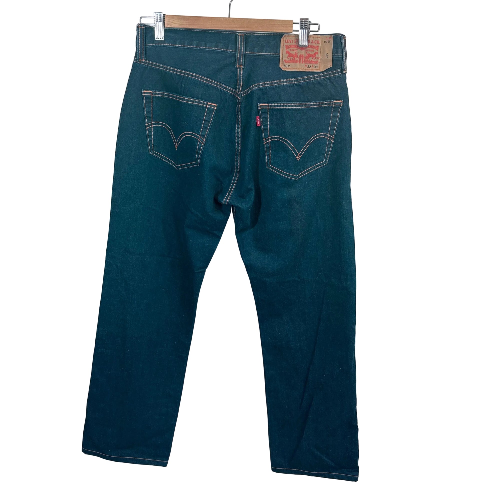 Classic Levi 501 button fly jeans in men's size 32" waist. These iconic straight-leg jeans feature the signature button fly closure and durable denim construction that defines the 501 silhouette. Gently used condition with minimal wear, offering authentic vintage appeal and reliable everyday comfort. A timeless wardrobe staple that pairs effortlessly with any casual or smart-casual outfit.