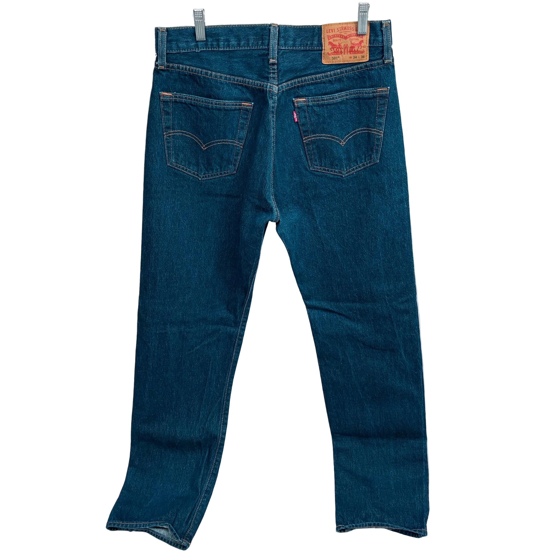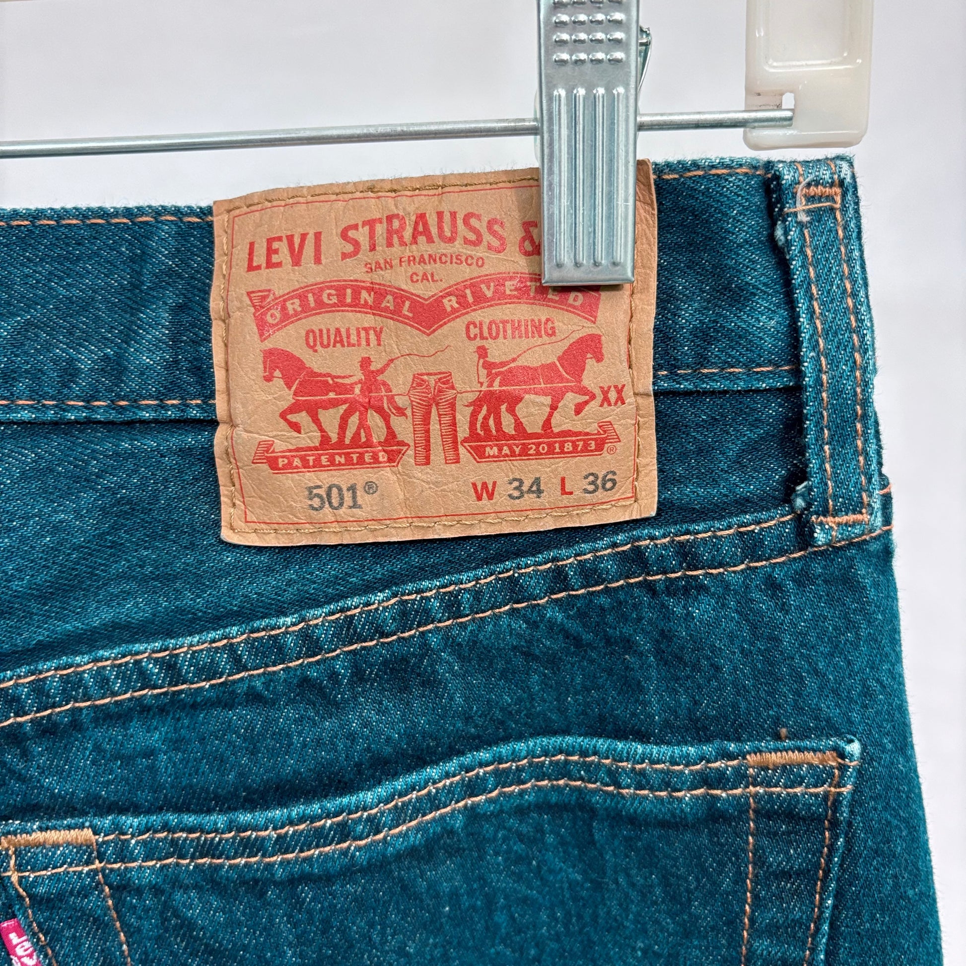 Iconic Levi 501 button fly jeans in a gently used condition, sized at 34" waist. These timeless denim staples feature the signature button fly closure and classic five-pocket construction that defined American workwear. The 501 cut delivers a straight-leg silhouette with a comfortable mid-rise fit, making them versatile for casual wear or styled up for a vintage-inspired look. Known for their durability and ability to develop character with wear, these jeans are a wardrobe essential that pairs effortlessly with everything from t-shirts to blazers. A smart choice for those seeking authentic, well-made denim with proven longevity.