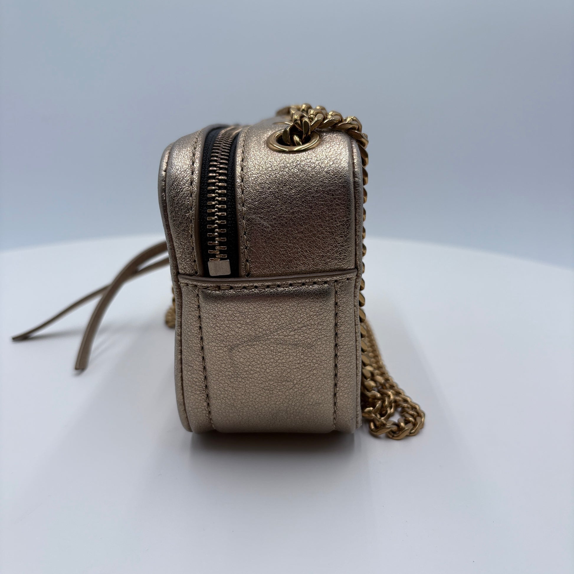Elevate your everyday carry with this Marc Jacobs Snapshop cross body purse, a timeless piece that seamlessly transitions from day to night. Crafted with meticulous attention to detail, this gently used bag features a refined silhouette and an elegant gold chain strap that adds a touch of sophistication. The structured design provides ample space for essentials while maintaining a polished aesthetic. Perfect for those who appreciate quality craftsmanship and understated luxury, this cross body style offers both practicality and style. A versatile investment piece for the discerning fashion enthusiast. 7"W X 4.5"H X 2.5D