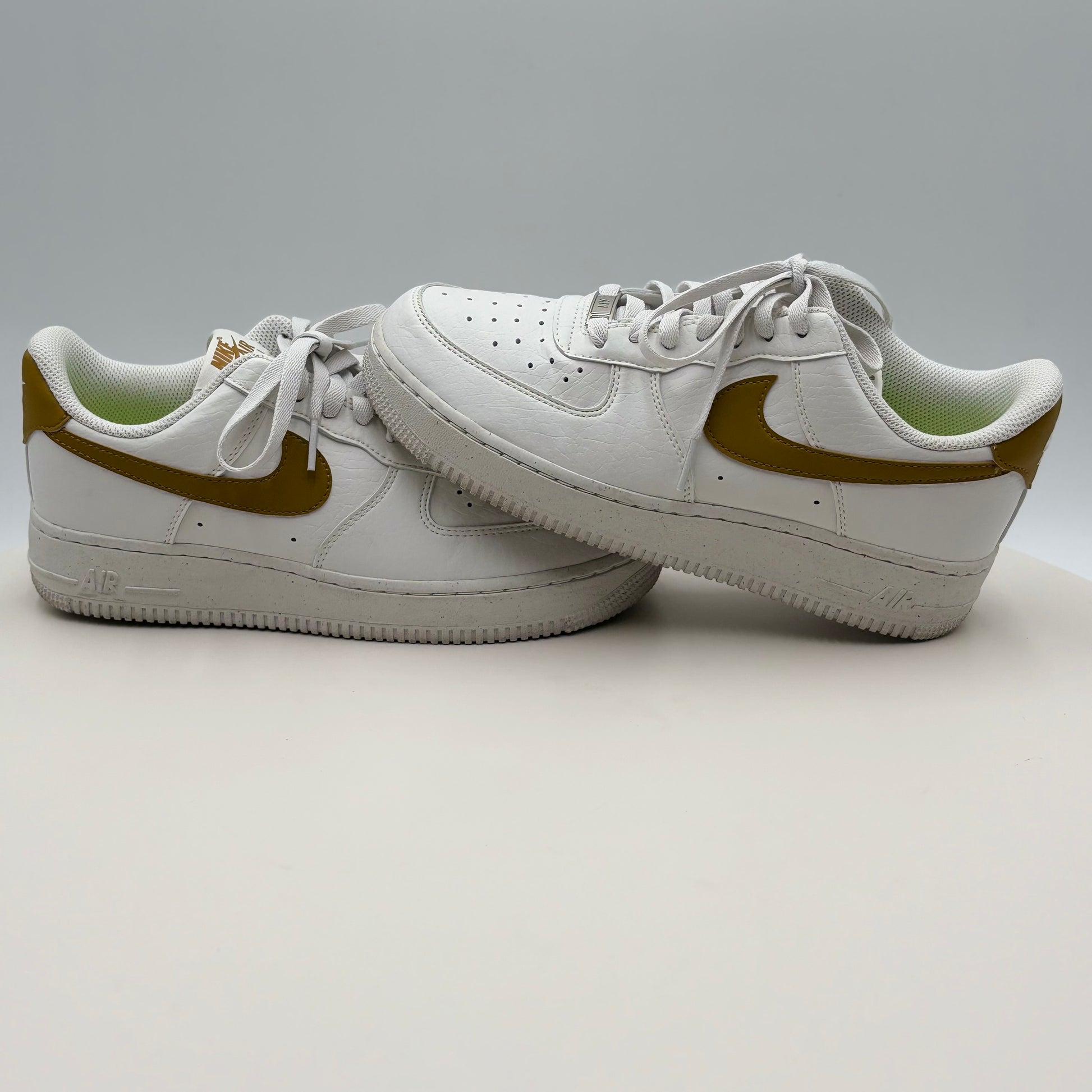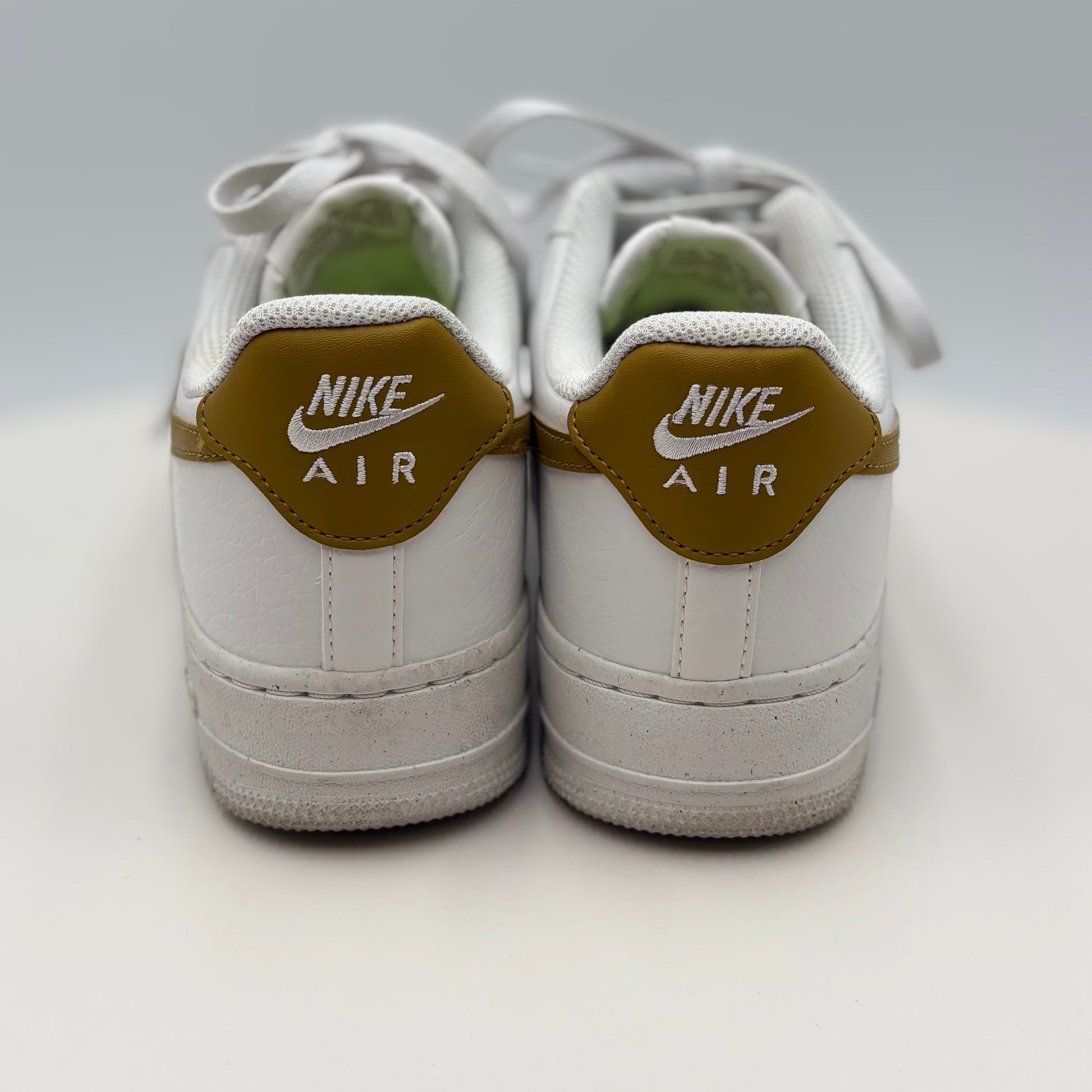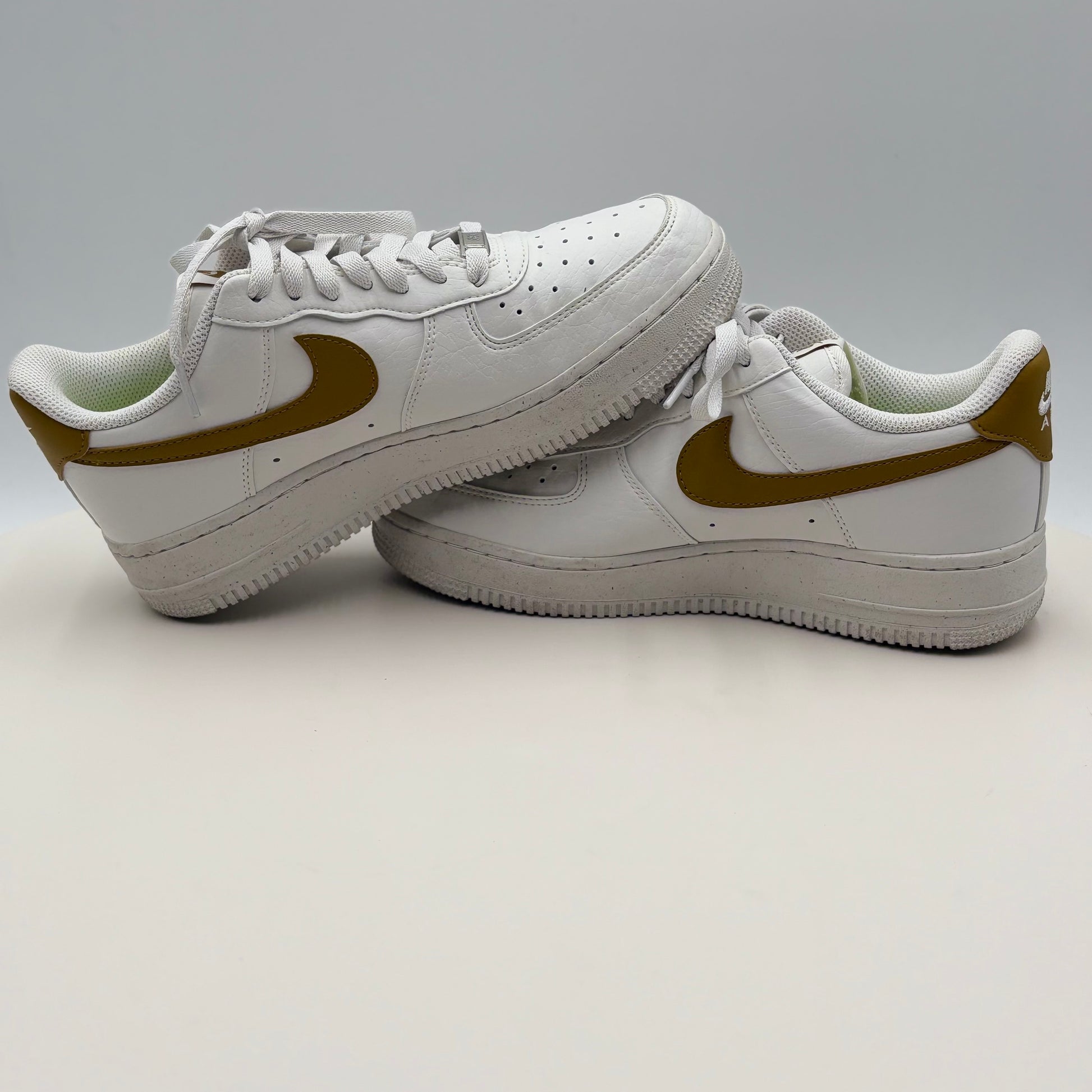 Nike Air Force 1 07 SE in Next Nature Bronzine delivers iconic silhouette with sustainable innovation. This gently used pair features the classic low-top design, premium leather construction, and the updated SE platform for enhanced comfort. The distinctive bronzine colorway offers versatile styling across casual and elevated looks. Next Nature technology incorporates recycled materials without compromising durability or aesthetic appeal. Ideal for sneaker enthusiasts seeking heritage style with environmental consciousness. Minimal wear preserves the shoe's integrity and value.
